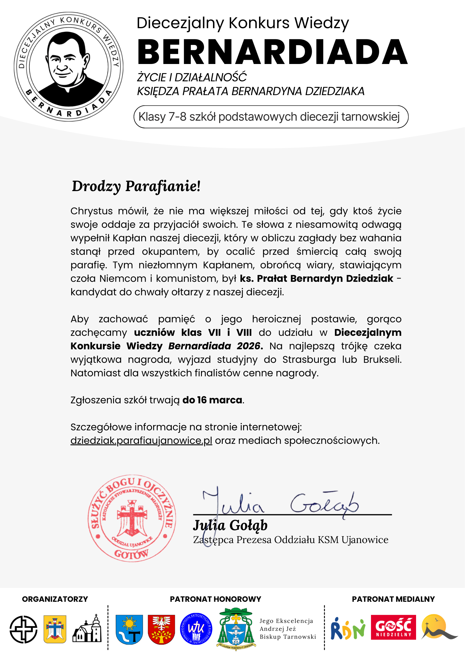 W imieniu Oddziału Katolickiego Stowarzyszenia Młodzieży przy parafii pw. św. Michała Archanioła w Ujanowicach oraz współorganizatorów,serdecznie zapraszamy do udziału w Diecezjalnym Konkursie Wiedzy "Bernardiada".